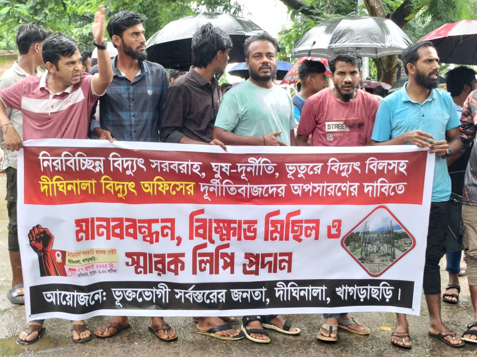 খাগড়াছড়ির দীঘিনালা উপজেলায় বিদ্যুৎ অফিসের বিরুদ্ধে লাগাতার অনিয়ম, ঘুষ-দুর্নীতি, ভুতুড়ে বিদ্যুৎ বিল এবং লো-ভোল্টেজ সমস্যার প্রতিবাদে আজ রবিবার দুপুরে ব্যাপক বিক্ষোভ মিছিল, মানববন্ধন ও স্মারকলিপি প্রদান কর্মসূচি পালিত হয়েছে।