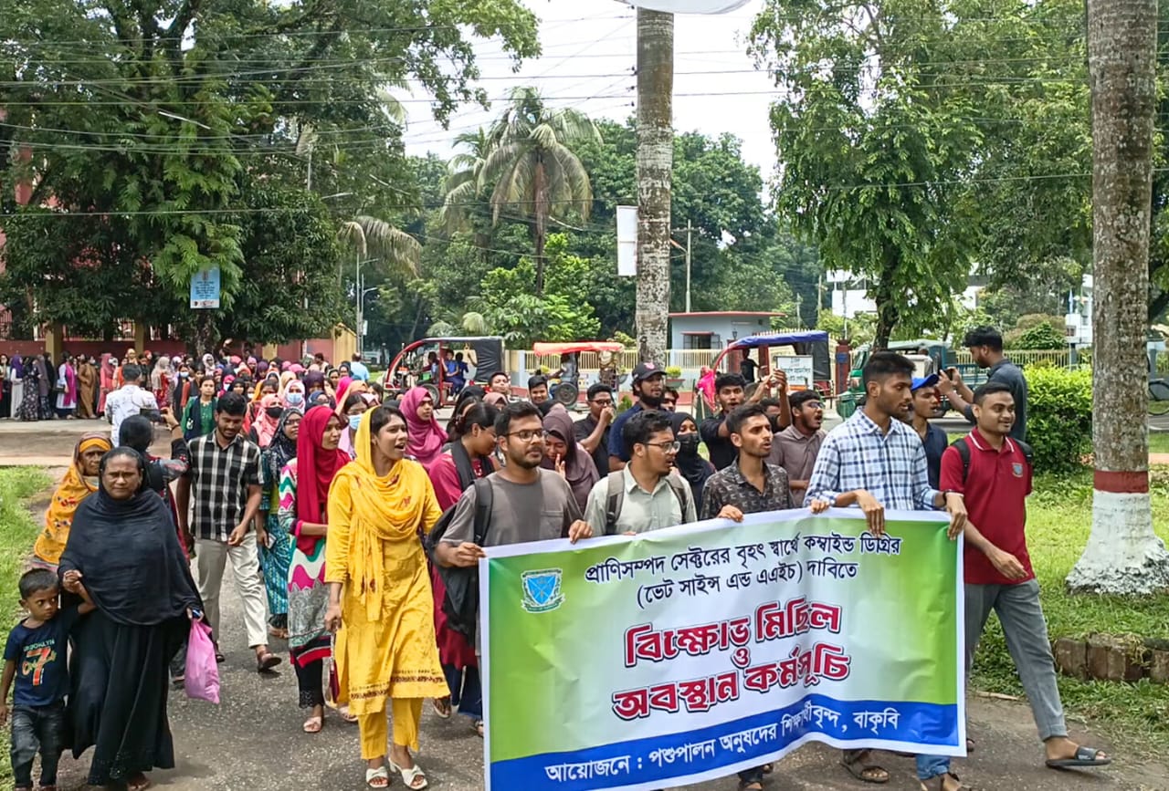 প্রাণিসম্পদ সেক্টরের বৃহৎ স্বার্থে কম্বাইন্ড ডিগ্রির (ভেট সাইন্স এন্ড এএইচ) দাবিতে বিক্ষোভ মিছিল ও অবস্থান কর্মসূচি করেছে বাংলাদেশ কৃষি বিশ্ববিদ্যালয়ের (বাকৃবি) পশুপালন অনুষদের শিক্ষার্থীরা। এতে উক্ত অনুষদের প্রায় তিন শতাধিক শিক্ষার্থীর অংশগ্রহণ করেন।