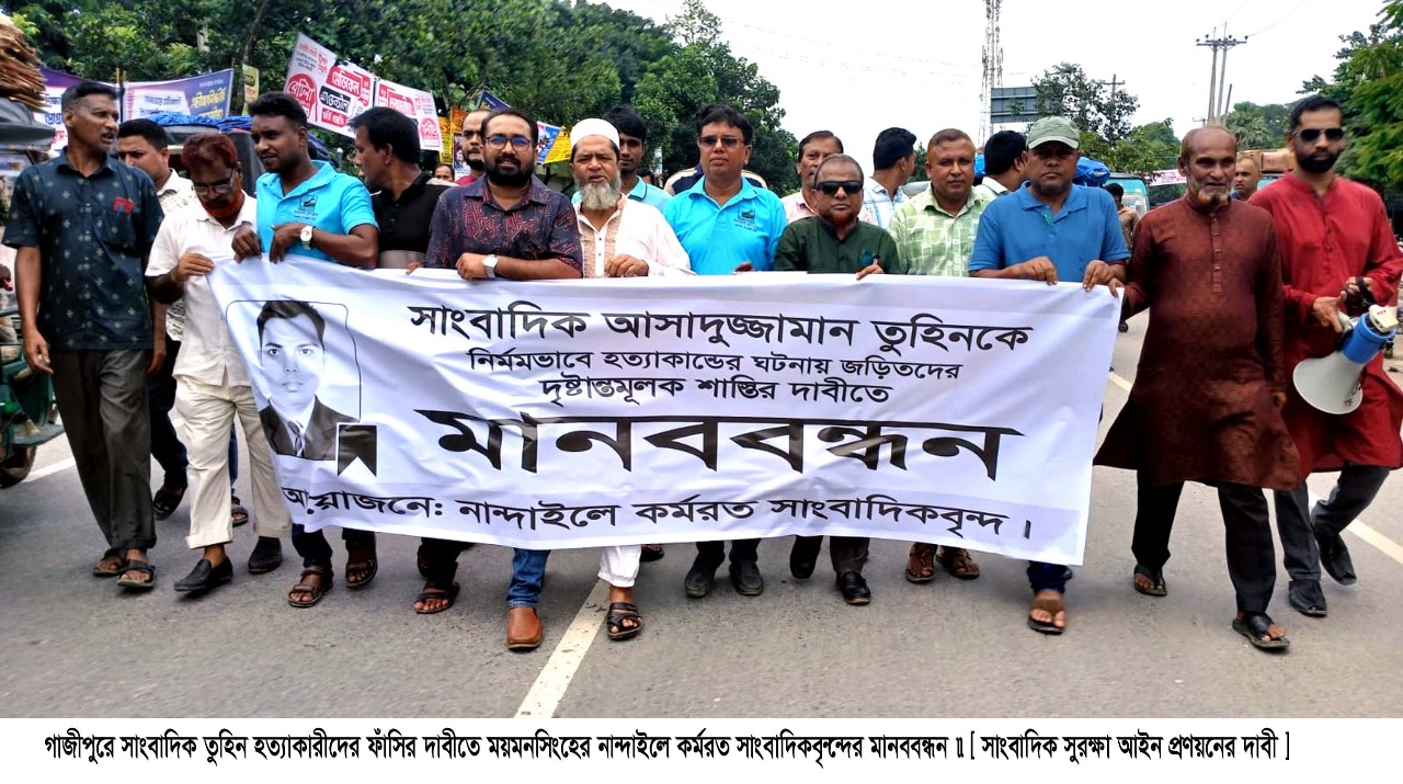 গাজীপুরের সাংবাদিক আসাদুজ্জামান তুহিন হত্যাকারীদের ফাঁসির দাবী সহ সাংবাদিকদের সুরক্ষা আইন প্রণয়নের দাবীতে মানববন্ধন করেছে ময়মনসিংহের নান্দাইল উপজেলার কর্মরত সাংবাদিকবৃন্দ। শনিবার (৯ আগস্ট) দুপুর ১২টায় উপজেলা পরিষদের সামনে ময়মনসিংহ টু কিশোরগঞ্জ মহাসড়কে এ মানববন্ধন অনুষ্ঠিত হয়। সাংবাদিক শামছ-ই-তাবরীজ রায়হানের সঞ্চালনায় বক্তব্য রাখেন সাংবাদিক এনামুল হক বাবুল, হান্নান মাহমুদ, অরবিন্দ পাল অখিল, আলম ফরাজী, মোখলেছুর রহমান, আহসান কাদের মাহমুদ, জহিরুল ইসলাম লিটন, এ হান্নান আল আজাদ প্রমুখ। বক্তারা সাংবাদিক তুহিন হত্যাকারীদের দৃষ্টান্তমূলক শাস্তি ফাঁিসর দাবী জানিয়ে অবিলম্বে সাংবাদিকদের নিরাপত্তায় সুরক্ষা আইন প্রণয়নের জন্য সরকারের প্রধান উপদেষ্ঠার প্রতি জোর আহ্বান জানান। এছাড়া আগামী ৩০ কর্মদিবসের মধ্যে সাংবাদিক তুহিন হত্যার বিচার না হলে সারাদেশে আরও কঠোর পদক্ষেপ নেওয়া হবে বলে বক্তারা জানান। মানববন্ধন শেষে একটি বিক্ষোভ মিছিল উপজেলা সদর কেন্দ্রীয় শহীদ মিনার হয়ে উপজেলা পরিষদ চত্বরে এসে শেষ হয়। এসময় নান্দাইলে কর্মরত ৩৫ জন সাংবাদিক উপস্থিত ছিলেন।