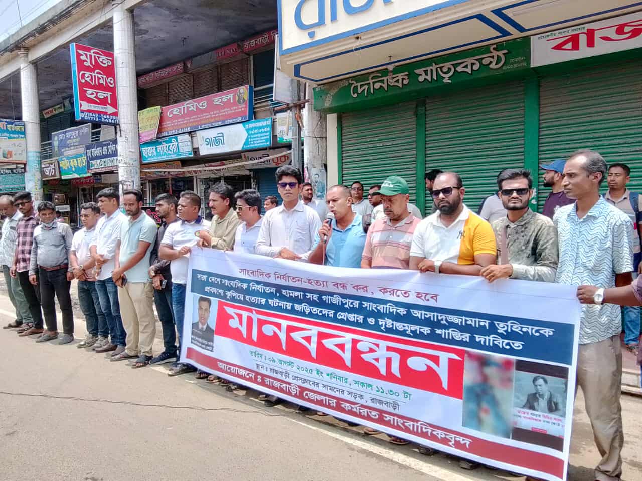 গাজীপুরে সাংবাদিক আসাদুজ্জামান তুহিনকে কুপিয়ে হত্যা ও সারাদেশে সংবাদিক নির্যাতনের প্রতিবাদে হত্যাকারীদের দ্রুত গ্রেপ্তার ও দৃষ্টান্তমুলক শাস্তির দাবীতে রাজবাড়ীতে মানববন্ধন ও বিক্ষোভ অনুষ্ঠিত হয়েছে।