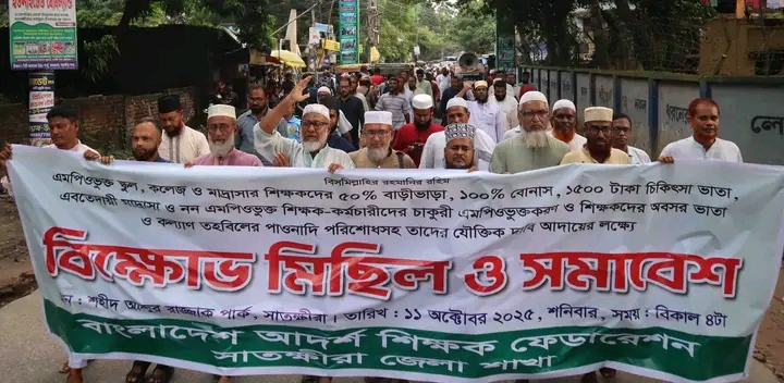 এমপিওভুক্ত স্কুল, কলেজ, মাদ্রাসা শিক্ষকদের ৫০শতাং, বাড়ি ভাড়া, ১০০শতাংশ বোনাস, ১৫০০ টাকা চিকিৎসা ভাতা, ইবতেদায়ী মাদ্রাসা ও নন-এমপিও শিক্ষা প্রতিষ্ঠান এমপিওভুক্ত করণ ও অবসর প্রাপ্ত শিক্ষকদের কল্যাণ তহবিল ও অবসর সুবিধার টাকা দ্রুত পরিশোধের দাবিতে বাংলাদেশ আদর্শ শিক্ষক ফেডারেশন সাতক্ষীরা জেলা শাখার বিক্ষোভ মিছিল ও সমাবেশ অনুষ্ঠিত হয়।