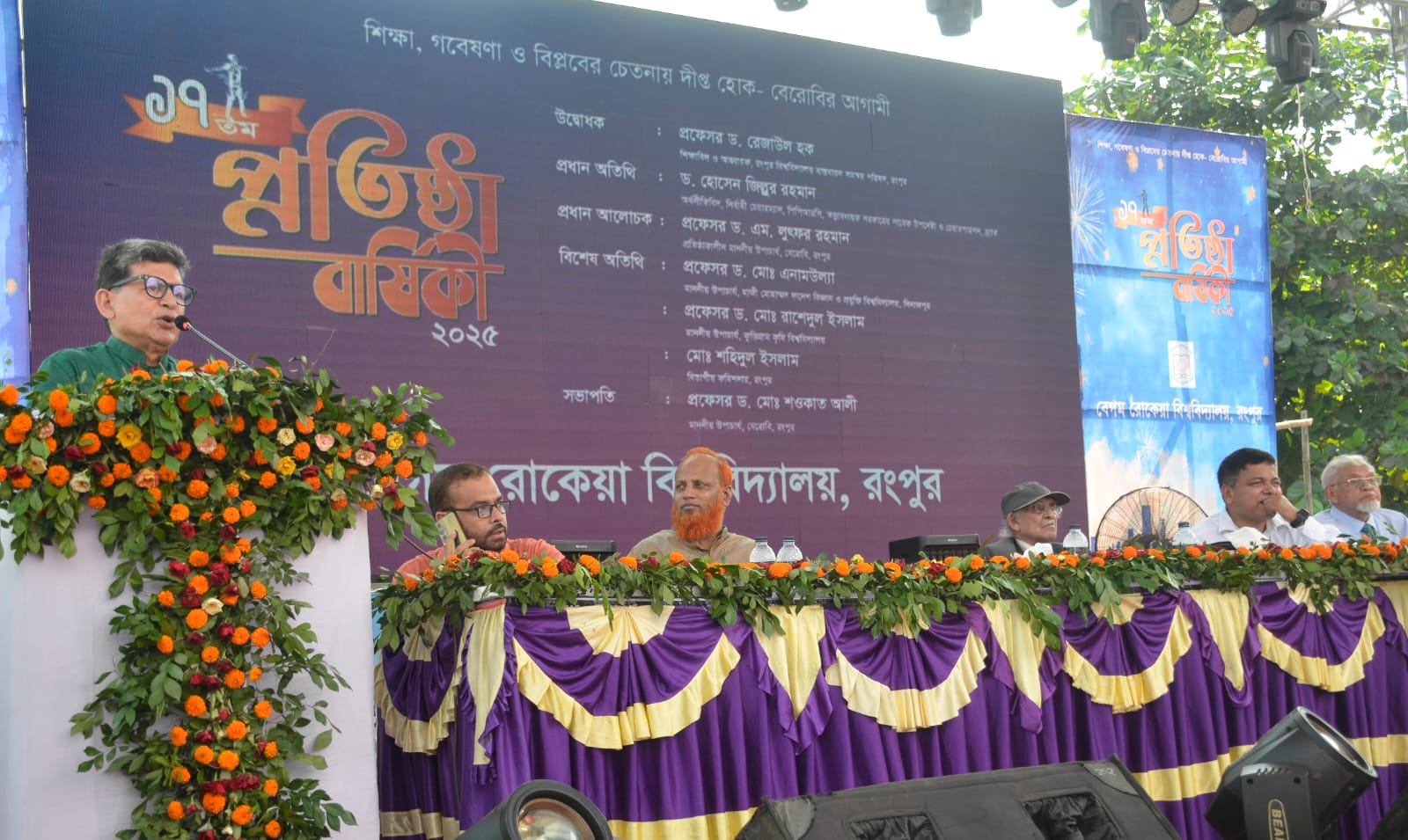 আজ রবিবার (১২ অক্টোবর, ২০২৫) বেগম রোকেয়া বিশ্ববিদ্যালয়, রংপুরের ১৭তম প্রতিষ্ঠাবার্ষিকী উদযাপন অনুষ্ঠানে প্রধান অতিথি হিসেবে বক্তৃতাকালে তিনি এসব কথা বলেন। শিক্ষাবান্ধব মানসিকতার শিক্ষক-শিক্ষার্থীর প্রয়োজনীয়তার ওপর গুরুত্বারোপ করে তিনি বলেন, অবকাঠামোগত ঘাটতি পূরণের পাশাপাশি প্রকৃতিবান্ধব পরিবেশ নিশ্চিত করতে হবে। বেগম রোকেয়া বিশ্ববিদ্যালয়কে নব উদ্যমে এগিয়ে নেওয়ার যাত্রায় সংযুক্ত থাকার আগ্রহ প্রকাশ করে তিনি বলেন, সঠিক দিক নির্দেশনা পেলে বেগম রোকেয়া বিশ্ববিদ্যালয় উত্তরবঙ্গ তথা দেশের মধ্যে উন্নত জ্ঞানের প্রতিষ্ঠান হিসেবে আগামীতে নিজেকে প্রতিষ্ঠিত করতে পারবে।