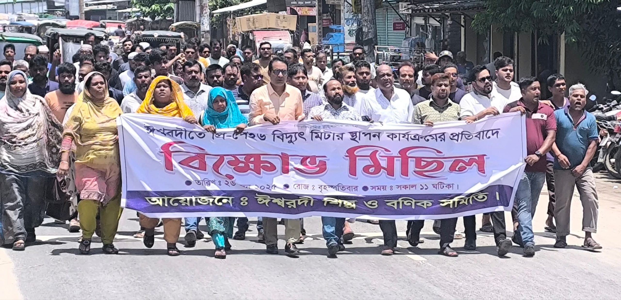 ঈশ্বরদীতে বিদ্যুতের প্রি-প্রেইড মিটার স্থাপন প্রকল্প বন্ধের দাবিতে ব্যবসায়ীদের বিক্ষোভ ও নেসকো অফিস ঘেরাও