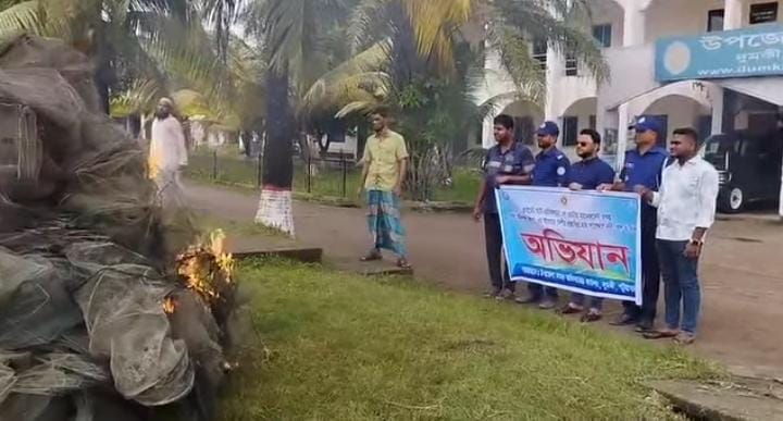 দুমকি উপজেলা প্রশাসন ও মৎস্য অধিদপ্তরের উদ্যোগে নিষিদ্ধ চায়না দুয়ারী ও বেত জাল জব্দে অভিযান।।