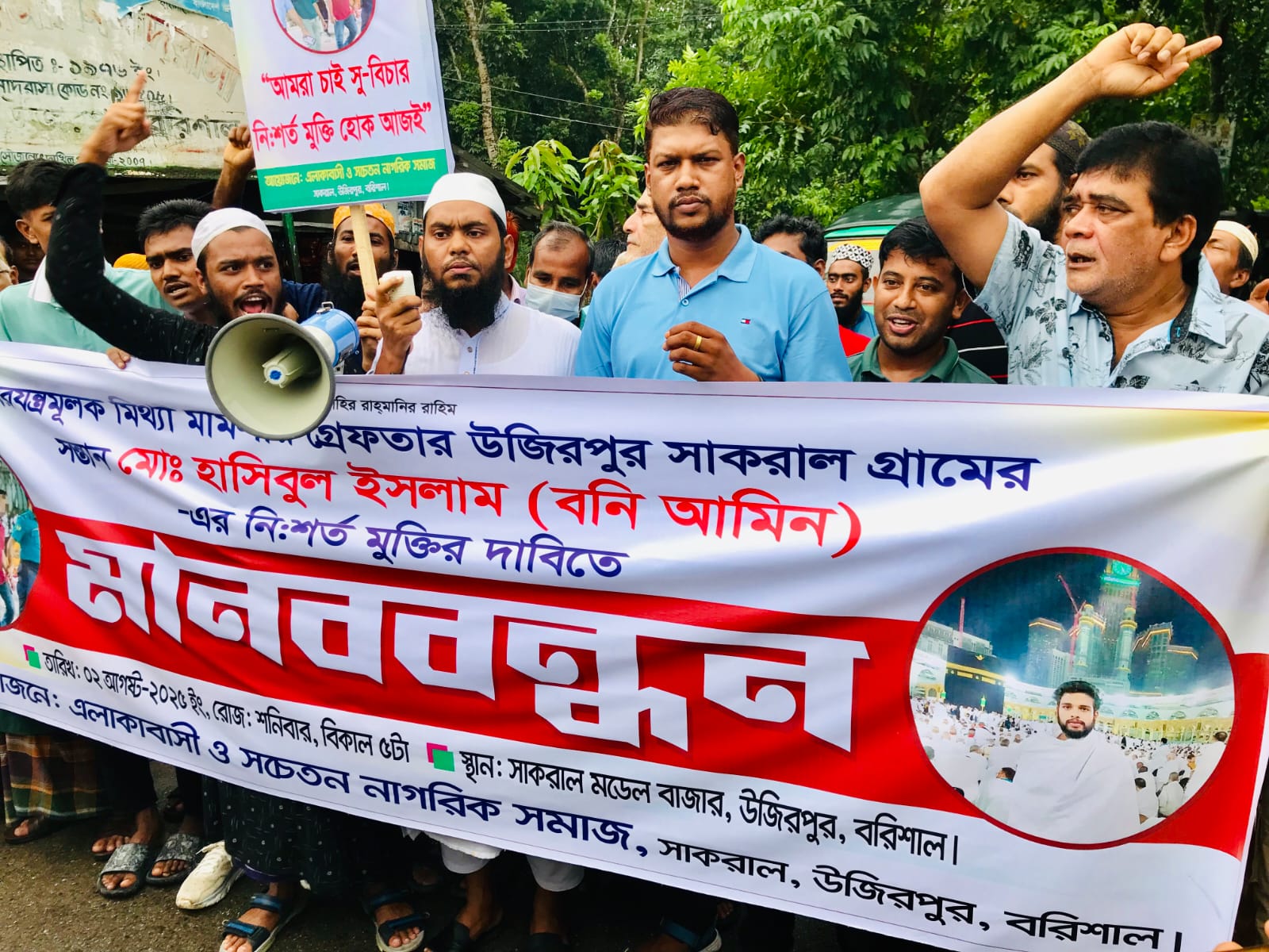 উজিরপুরে ষড়যন্ত্র ও মিথ্যা মামলায় গ্রেফতার বনি আমিনের নিঃশর্ত মুক্তির দাবিতে মানববন্ধন ও বিক্ষোভ মিছিল। মাহফুজুর রহমান মাসুম, উজিরপুর বরিশাল