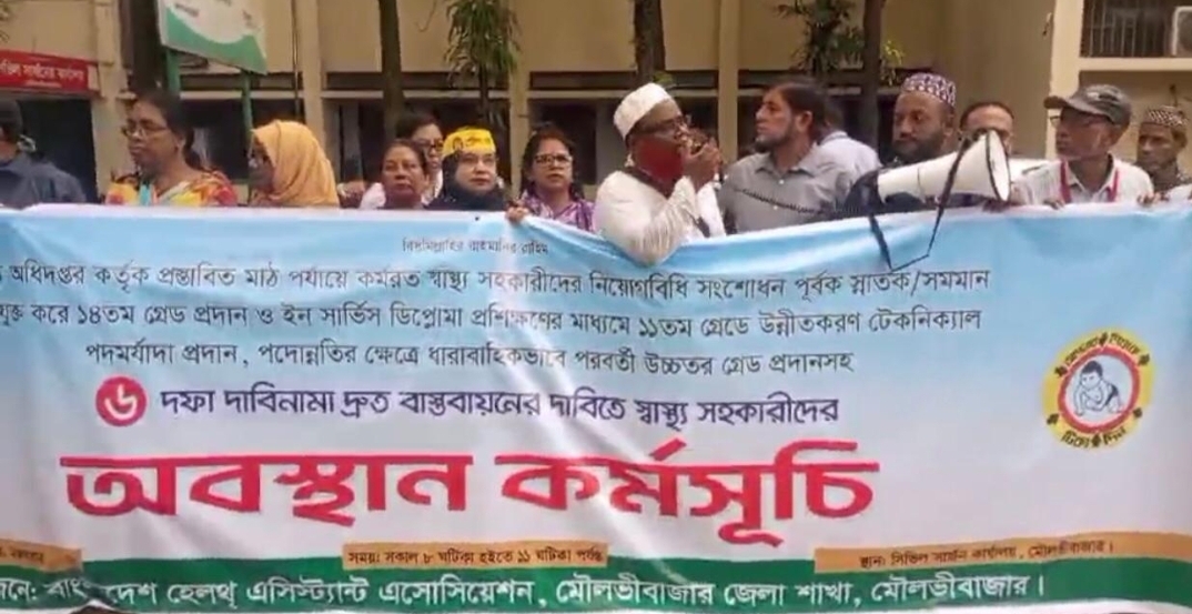 মৌলভীবাজারে ছয় দফা দাবীতে স্বাস্থ্য সহকারীদের অবস্থান কর্মসূচি পালন
