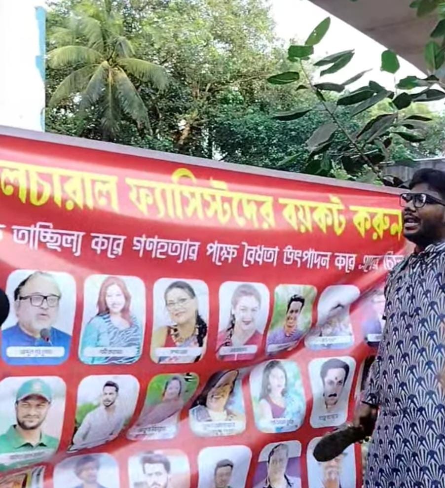 কালচারাল ফ্যাসিস্টদের’ ছবিতে জুতা নিক্ষেপ কর্মসূচি করেছে ঢাবি শিক্ষার্থীরা।