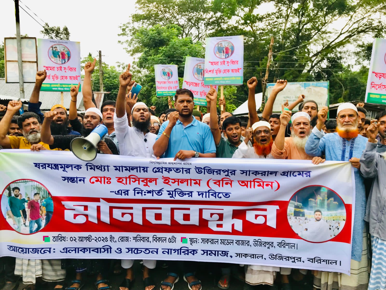 মিথ্যা মামলায় গ্রেফতার বনি আমিনের নিঃশর্ত মুক্তির দাবিতে মানববন্ধন ও বিক্ষোভ মিছিল। মাহফুজুর রহমান মাসুম- উজিরপুর বরিশাল প্রতিবেদক: বরিশালের