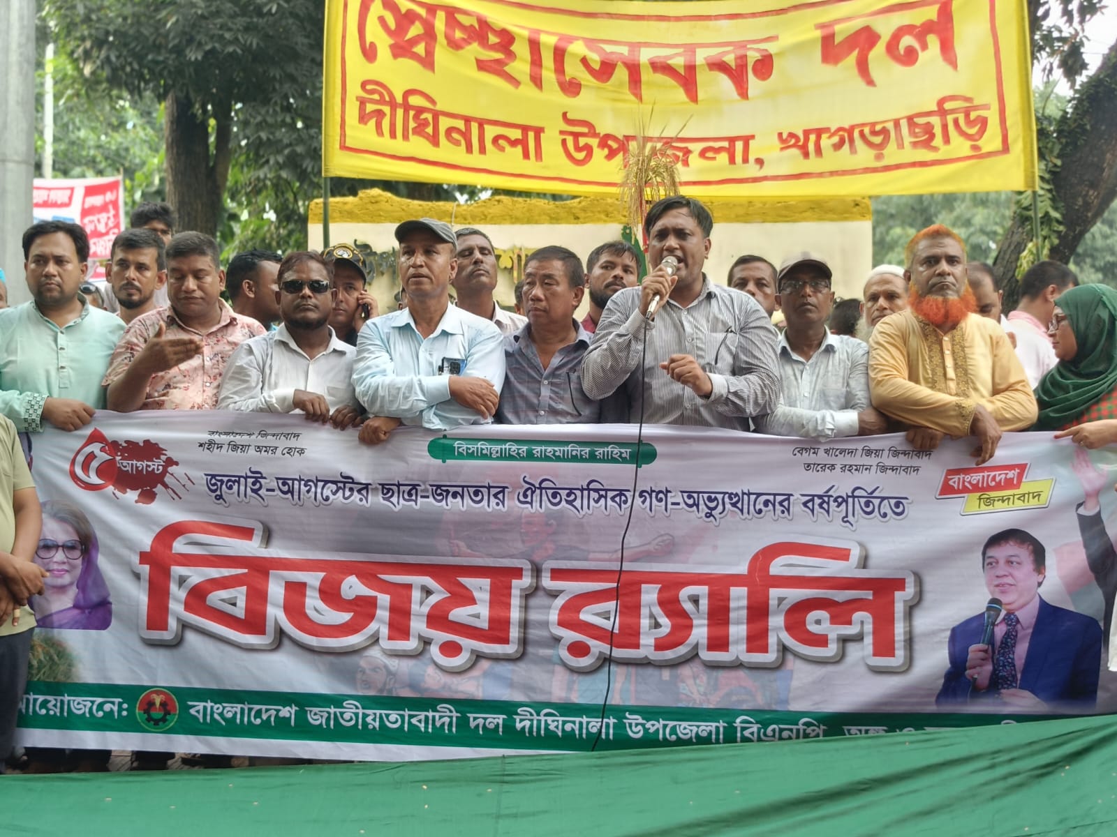 বিএনপির বিজয় র্যালি ও আনন্দ মিছিল অনুষ্ঠিত। মোঃ হাচান আল মামুন, দীঘিনালা (খাগড়াছড়ি) প্রতিনিধি : গণ-অভ্যুত্থানের এক বছর পূর্তি উপলক্ষে