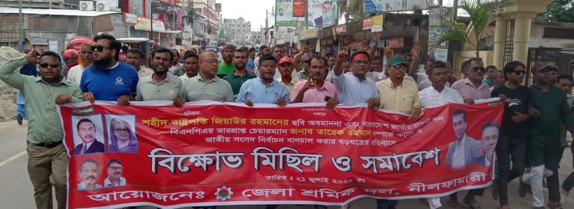 জিয়াউর রহমানের ছবি অবমাননা ও তারেক রহমানকে কটুক্তির প্রতিবাদে নীলফামারীতে শ্রমিকদলের বিক্ষোভ সমাবেশ