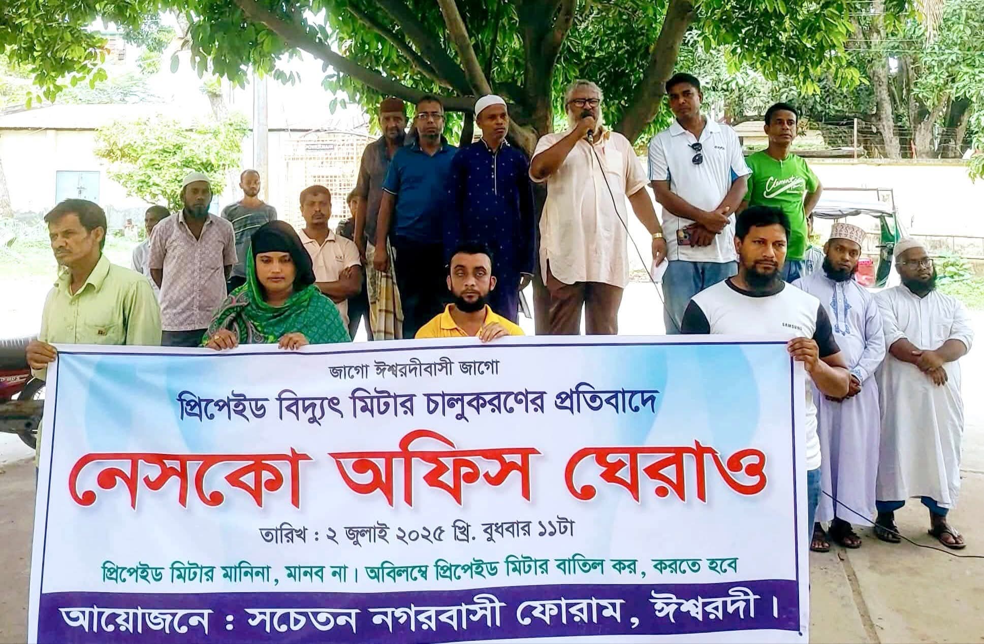 প্রিপেইড বিদ্যুৎ মিটার চালুকরনের প্রতিবাদে নেসকো অফিস ঘেরাও কর্মসূচী পালন